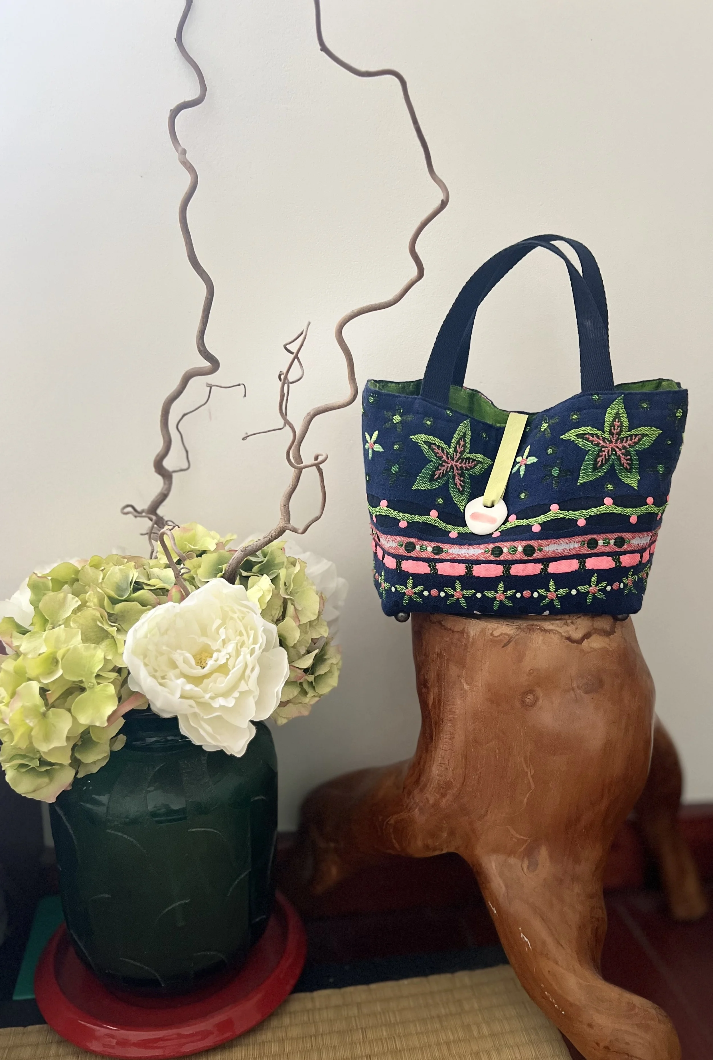 Habillé de soies précieuses haute couture, il est fermé par des talismans symboles des 4 éléments (de pierre, de bois ou de métal), véritables charmes Alchymiques, inspirés des « omamori japonais », petits gardiens silencieux, messagers de l’invisible. Ils murmurent des incantations douces, des mantras de force ou des bénédictions…